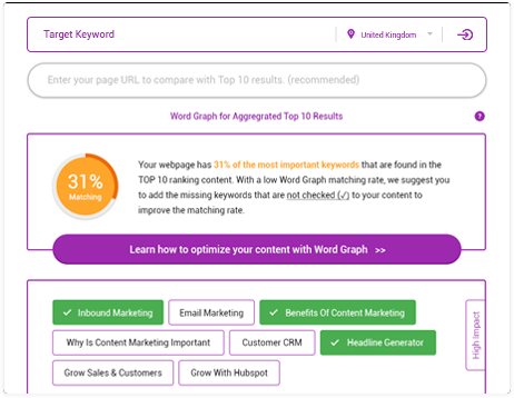 Just by entering your URL and keyword, you will get to know how close your content/website is to getting ranked on the first page of SERP. You will also have your Word Graph score and metrics presented so you can see the comparison within the Top 10 results.